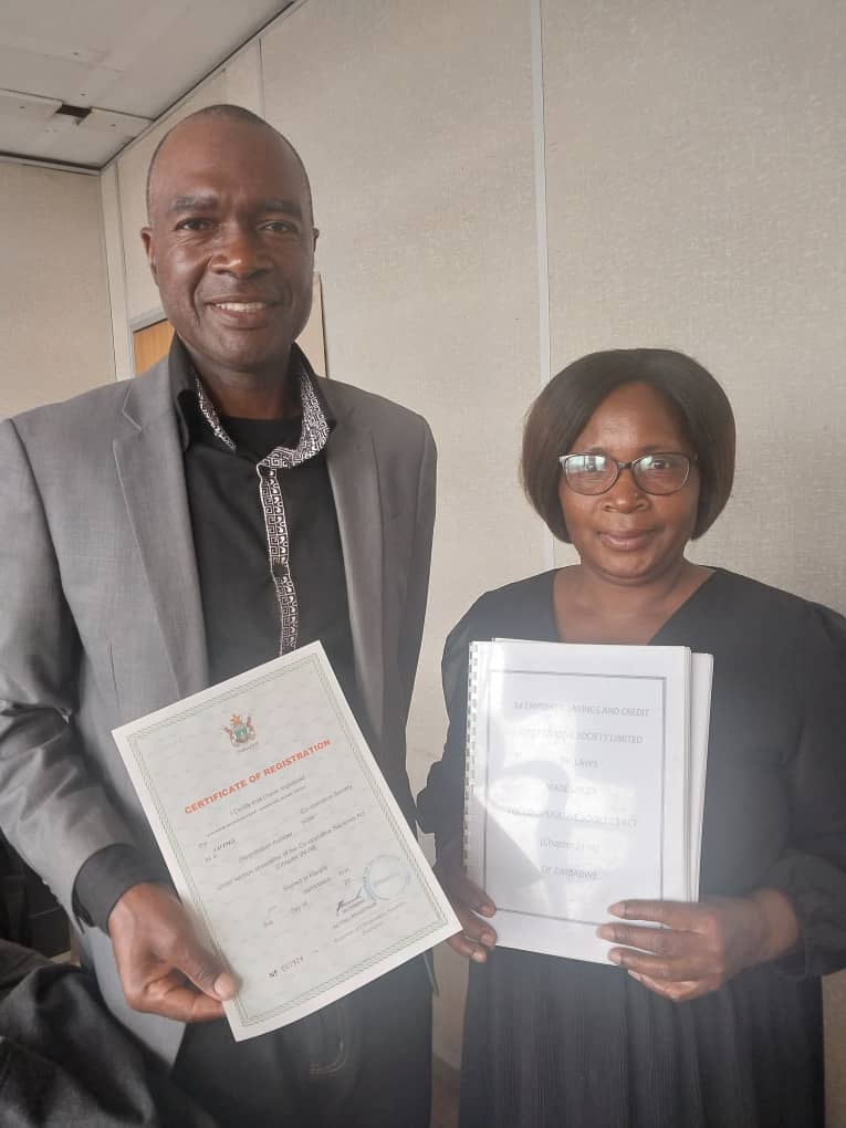 Management committee members Mr T. Chihungwa and Ms Tracy Simbi holding the registration certificate and the by-laws.